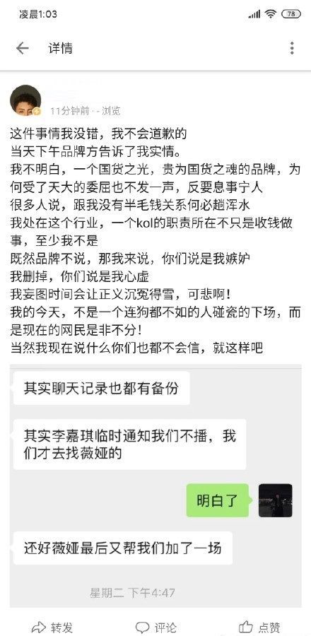不过,这起风波似乎还没有结束。有某同样是化妆品直播主播的董子初则是发文疑似内涵李佳琦,暗示李佳琦是自导自演,某国产品牌才是“受害者”。据说,其实并非某国产品牌“放鸽子”,而是李佳琦突然不愿意给其带货了。