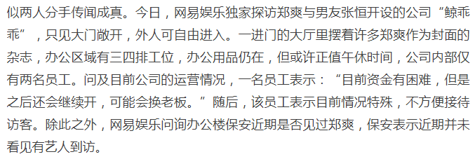 除此之外,在问及公司目前的运营状况时,就有员工告诉记者说目前资金有困难,近期可能会换老板。说起来郑爽为这家公司花费了不少金钱和时间,除非真的开不下去或者是和合伙人出现巨大不可调和的矛盾,否则她是舍不得离开公司的。