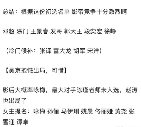 前段时间,金鸡奖公布了宣传海报和形象大使,各项评选工作也是正式开始。就在今天有知情人在网上发文称,相关的初选工作已经接近尾声,大部分的结果都已经出炉了。