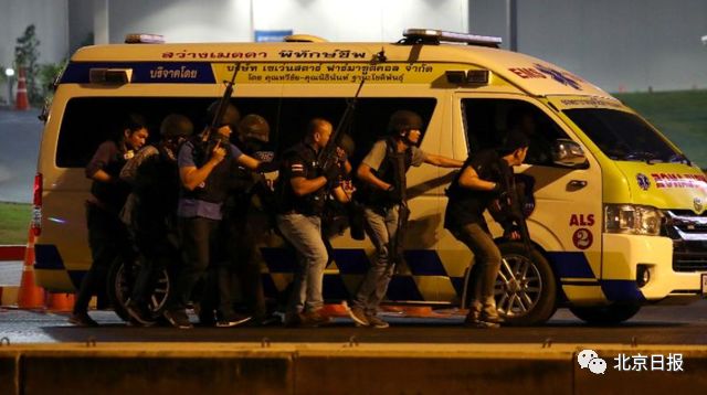 据报道,一名泰国士兵8日从呵叻府一个军事基地偷出武器,开枪打死自己的长官和另外2人后驾车逃到一家大型商场附近,朝人群开火。枪手随后进入商场,将16名人质困在商场的四楼,与警方形成对峙。