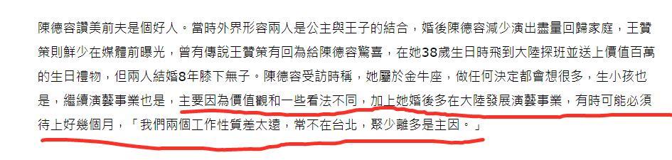 陈德容表示离婚主因是聚少离多,婚后她因工作需要有时必须离家几个月,双方相处时间较少,价值观和一些问题上的看法也不同。