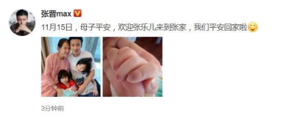 11月19日,张晋在微博宣布一则喜讯,三胎儿子诞生,母女平安。